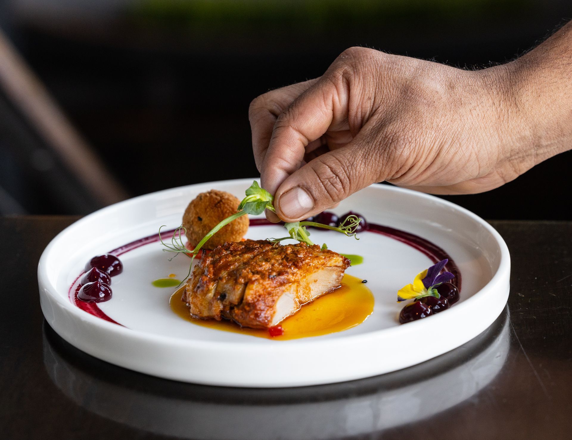 - Tellicherry Tharavu – Barbary duck with cabbage, artichoke purée, and plum gel
